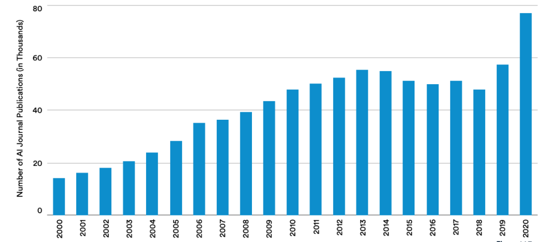 2000-2020 年 AI 期刊论文发表数量。