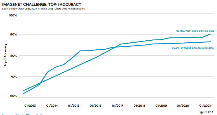 ImageNet 挑战的 TOP-1 准确率变化。