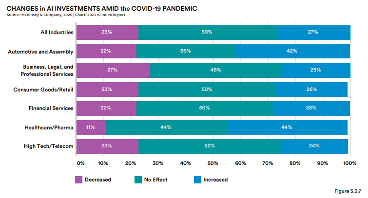 尽管疫情导致了经济衰退,麦肯锡的一项调查中有一半的受访者表示冠状病毒对他们在 AI 领域的投资没有影响,而实际上有 27% 的人表示他们的投资有所增加。不到四分之一的企业减少了对 AI 的投资。