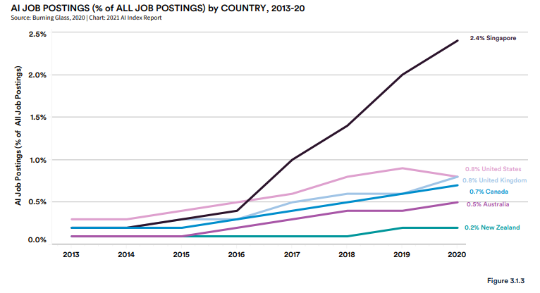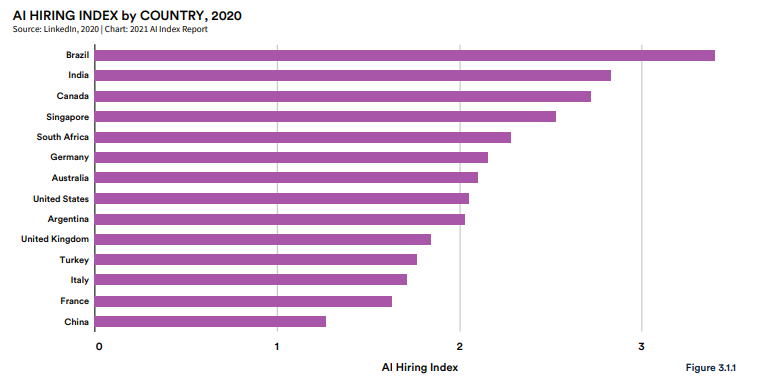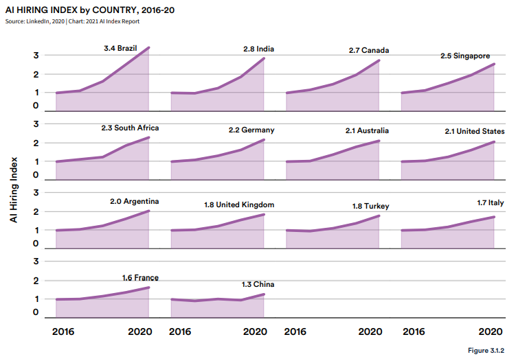 巴西、印度、加拿大、新加坡和南非是 2016 年至 2020 年 AI 招聘增长最快的国家。尽管出现了 COVID-19 大流行,但所有采样国家 2020 年的 AI 雇佣人数仍在继续增长。