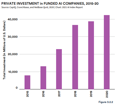 2015-2020 年度 AI 基金公司的私人投资额。
