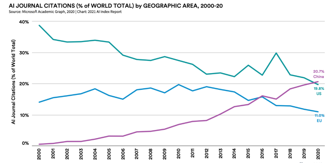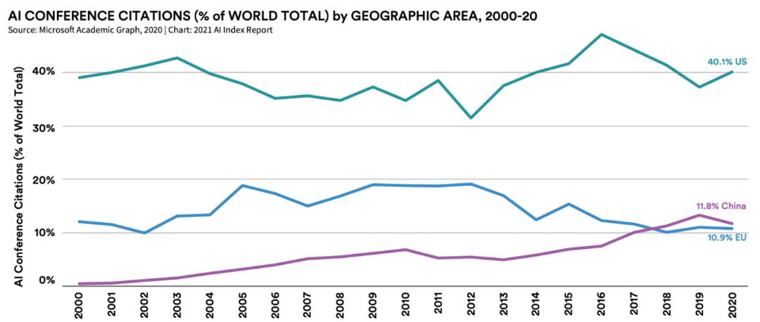 2019 年,中国的 AI 会议论文发表数量占比超过美国。然而,从 AI 会议论文被引用量来看,美国在过去 21 年中持续占据主导地位。2020 年,美国以 40.1% 的比例名列第一,中国则以 11.8% 的比例位居第二,二者差距仍然很大。