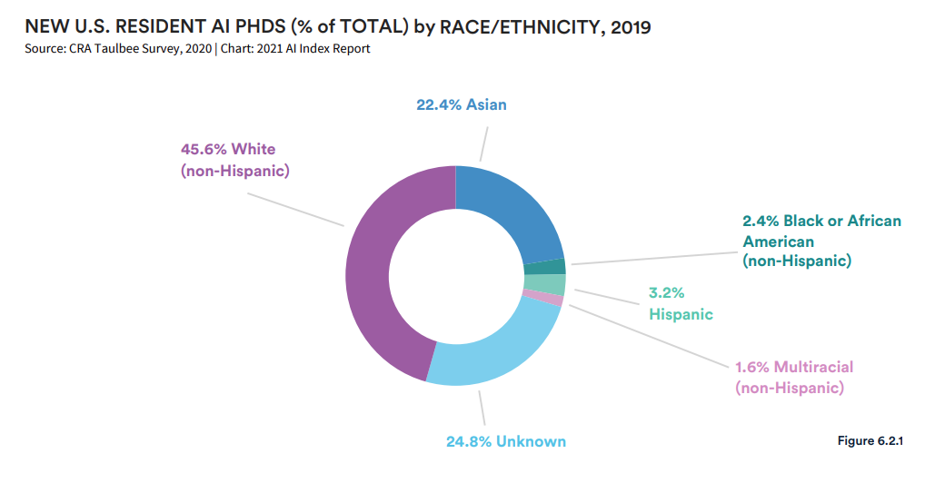 此外,根据 CRA 的 Taulbee 调查,2019 年新增的美国居民 AI 博士生中,白人 (非西班牙裔) 所占比例最高(45.6%) ,其次是亚洲人 (22.4%),非洲裔美国人(非西班牙裔,2.4%)和西班牙裔(3.2%)占比很低。