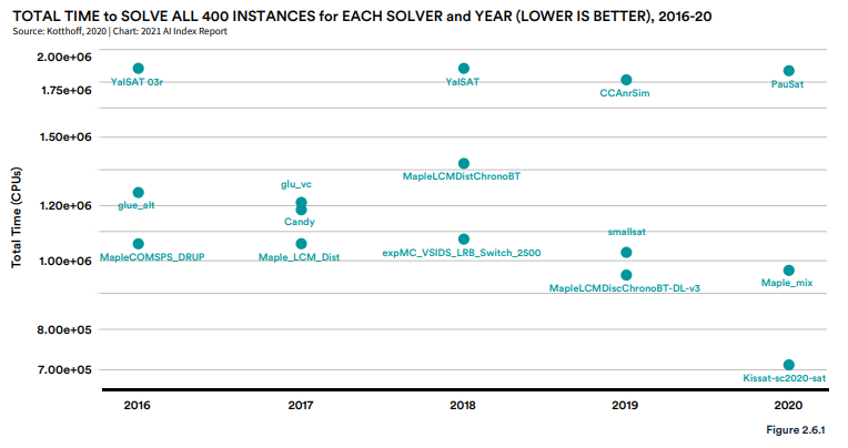 大多数技术问题的度量都显示了在固定的基准上,即每个时间点最佳系统的性能。针对 AI 指数开发的新分析提供了一些指标,这些指标考虑到了一个不断发展的基准,并考虑到随着时间的推移,将一组系统的总体性能的一部分归因于单个信用系统。这些分析适用于两个符号推理问题:自动定理证明和布尔公式的可满足性。