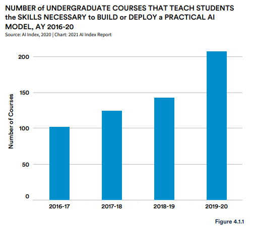 2020 年进行的一项 AI 指数调查显示,过去四年中,世界顶尖大学加大了对人工智能教育的投入。在过去的四个学年里,在本科和研究生阶段教学生构建或部署实用 AI 模型所需技能的课程数量分别增加了 102.9% 和 41.7%。