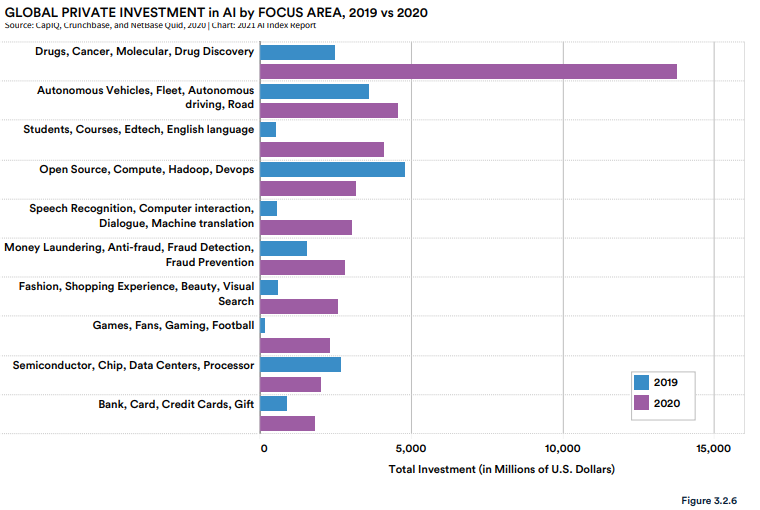 药物、癌症、分子、药物发现是 2020 年私人 AI 投资额最大的一个项目,超过 138 亿美元,是 2019 年的 4.5 倍。