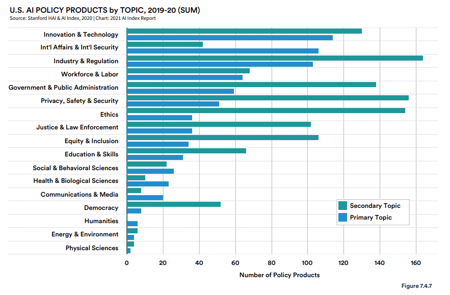 2019 年和 2020 年的综合数据表明,创新与技术、国际事务和国际安全、工业和监管等主题是美国人工智能政策文件的主要关注点。