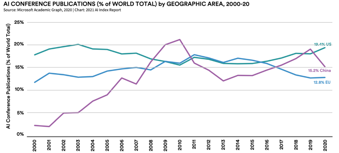 过去十年,AI 会议论文数量呈迅猛增长态势。2020 年,AI 会议论文数量占所有会议论文的比例已高达 20.2%。