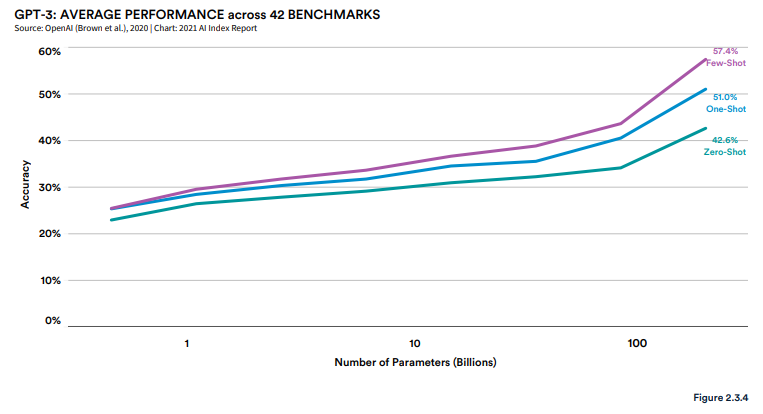 GPT-3 在 42 个基准上的表现。