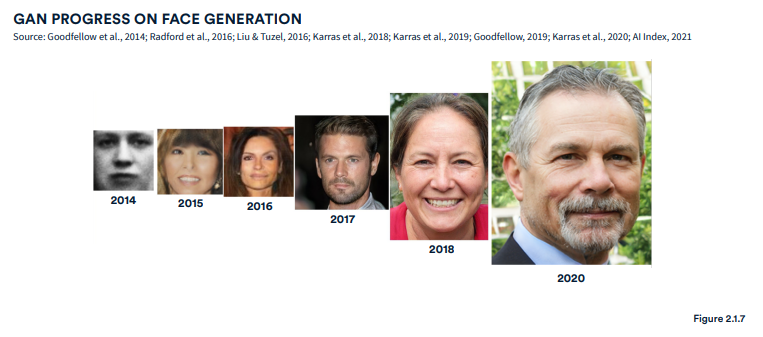 合成媒体(deepfake)数量大增,文本、图像、视频合成方面都出现了突破。这显示了 AI 的飞快发展,但也引发了人们对其滥用、误用的潜在担忧;