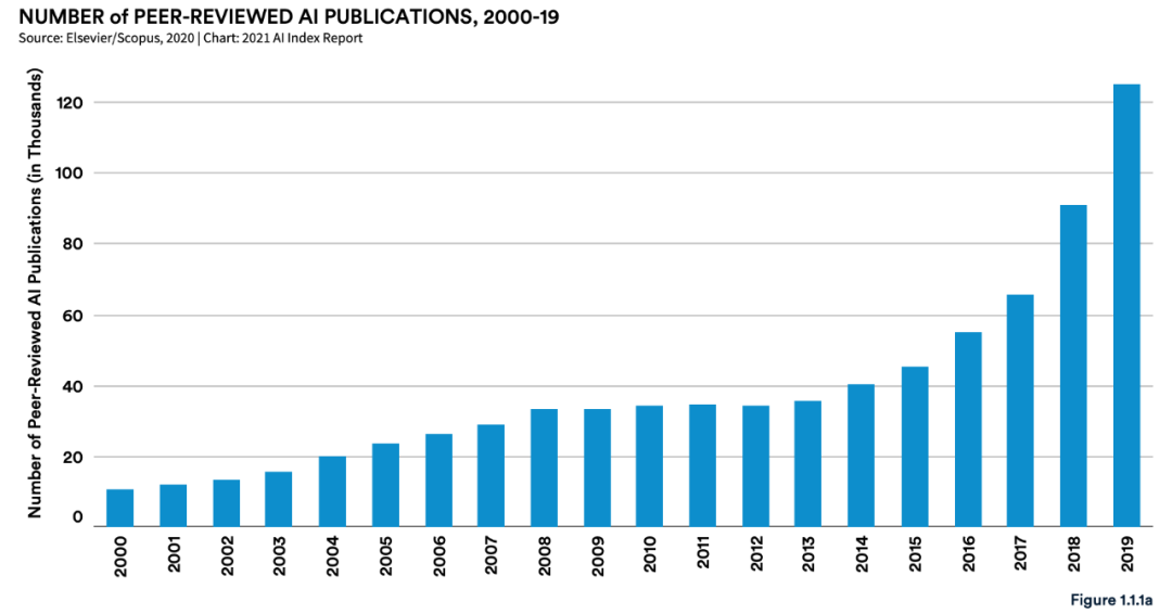 自 2000 至 2019 年,同行评审 AI 论文数量增长了约 12 倍,同期同行评审论文占所有论文发表量的比例从 2000 年的 0.82% 增长到 2019 年的 3.8%。