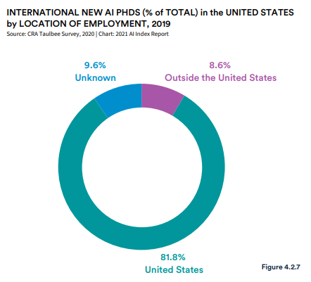 2019 年,北美 AI 博士中的国际学生比例继续上升,达到 64.3%,相比 2018 年增长 4.3%。在外国毕业生中,81.8% 的国际学生选择留在美国,8.6% 的人选择在美国以外的地方工作。