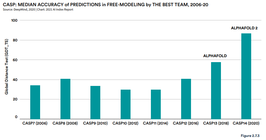 2006-2020 年 CASP 最佳团队在自由建模中的预测准确度。