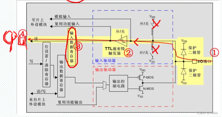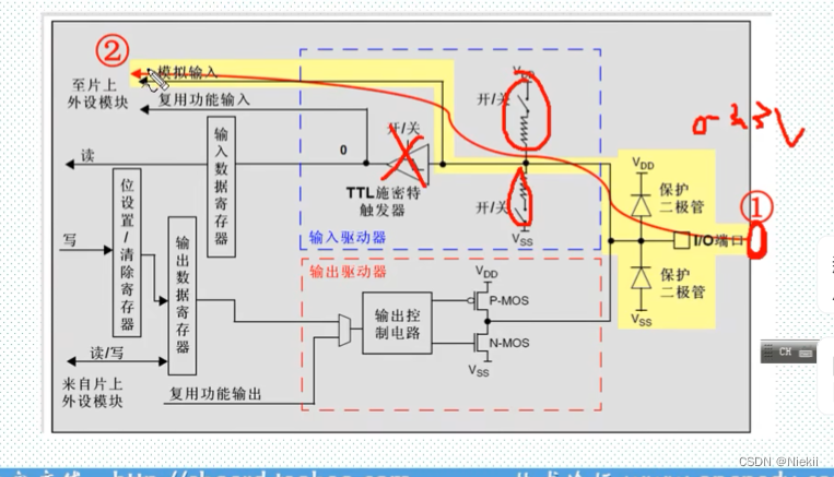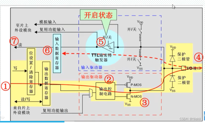 输出控制电路为0,则N-MOS开启即有效; 就被拉到vss,IO端口低电平有效