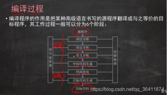 - 编译程序(编译器):将源程序翻译成目标程序(目标代码),然后再在计算机上运行目标程序。(先全部翻译,后一次执行)一般分为两个阶段: