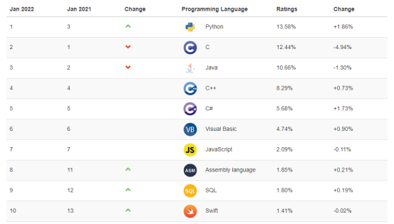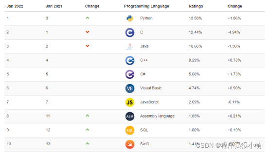Python有什么真正的竞争者吗?未来有什么新的、闪亮的语言可以竞争吗?如果我们看看过去几年那些有前途的语言,我们会看到在2021年有以下变化:Swift从13位上升到第10位,Go从14位上升到第13位,Rust保持26位没有改变,Julia从23位下滑到第28位,Kotlin从40位上升到第29位,Dart从25位下滑到37位,TypeScript从42位上升到第49位。所以,除了Swift和Go,预计不会很快有任何新的语言会进入前5名甚至前3名。