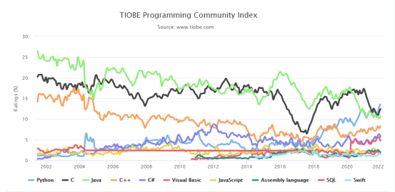 Python从2021年初的排行榜第3位开始不断上升,直至将Java和C抛在身后,成为排行榜第1名。但Python的流行并不止于此。目前,它已领先第二名1%以上。虽然距离Java在2001年达到的26.49%的最高历史记录还很遥远,但是Python已经成为了许多领域事实上的标准编程语言,没有迹象表明Python的这种高歌猛进会很快停止。
