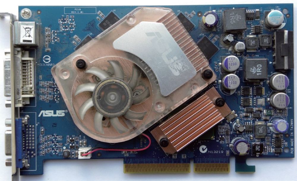 英伟达的GeForce 6600GT新版本原生支持PCIe接口,但是为了支持AGP市场,不得不采用双向桥接芯片转换成AGP接口,散热器下方的为桥接芯片。