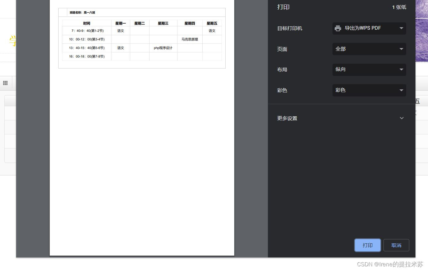 3.学生打印课程表界面: