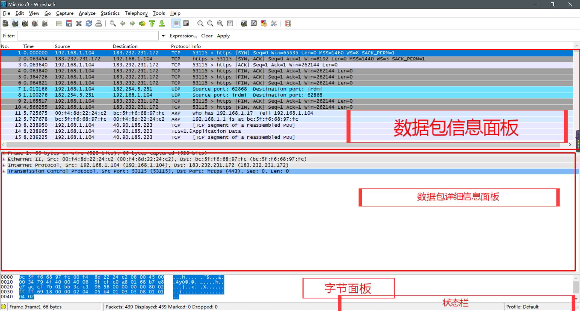 我们随便点开其中的一个数据包。可以直观地看到它的源IP为192.168.1.104,目的IP为183.232.231.172。这个数据包访问的是哪个网站呢?