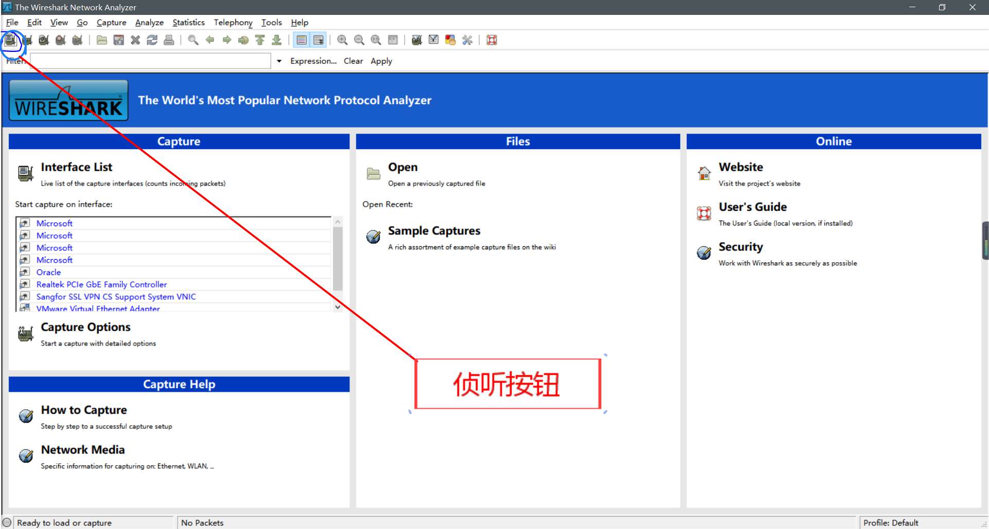首先我们要打开wireshack软件,图片中用蓝色记号笔标出来的按钮的作用是选择用户所需要侦听的窗口。再上面一行为菜单栏。wireshack中还有很多有意思的按钮我们将在以后的博客中进行介绍。