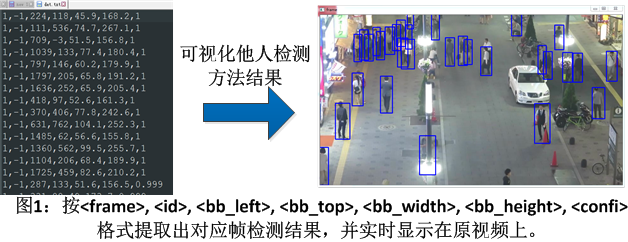 在基于检测的跟踪框架(tracking-by-detection)下,为了方便研究者对比多目标跟踪方法的性能,多目标跟踪标准平台不仅提供了统一的验证视频,有时还提供某类检测方法在标准视频上检测结果。本文主要介绍了如何将多目标跟踪基准平台(Multiple Object Tracking Benchmark,https://motchallenge.net/)提供的DPM, Faster-RCNN, and SDP.检测结果可视化实时显示到对应的视频上,并提供相应代码。 首先介绍了用于行人多目标跟踪的MOT-17数据集提供的DPM, Faster-RCNN, and SDP三种方法对应的论文出处,以及用于车辆跟踪的UA-DETRAC数据集提供的DPM, ACF, RCNN, and ComACT三种方法的论文出处。 然后下载MOT-17提供的检测结果和相应的视频,读取检测结果,解析后实时显示在视频上。具体过程下图所示: