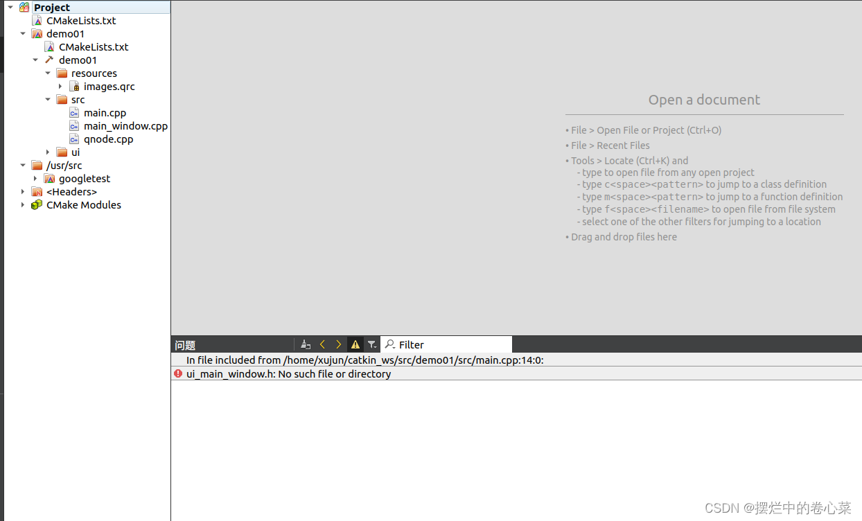 ② 创建完成以后通过qtcreator打开QT,文件->打开项目->选择工作空间下的cmakelist.txt(==注意并非功能包下的==)