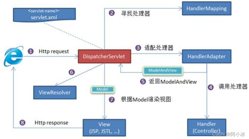1、通过IE或其他 浏览器请求接口,发送HTTP请求,我们这个请求会被前端控制器DispatcherServlet捕获