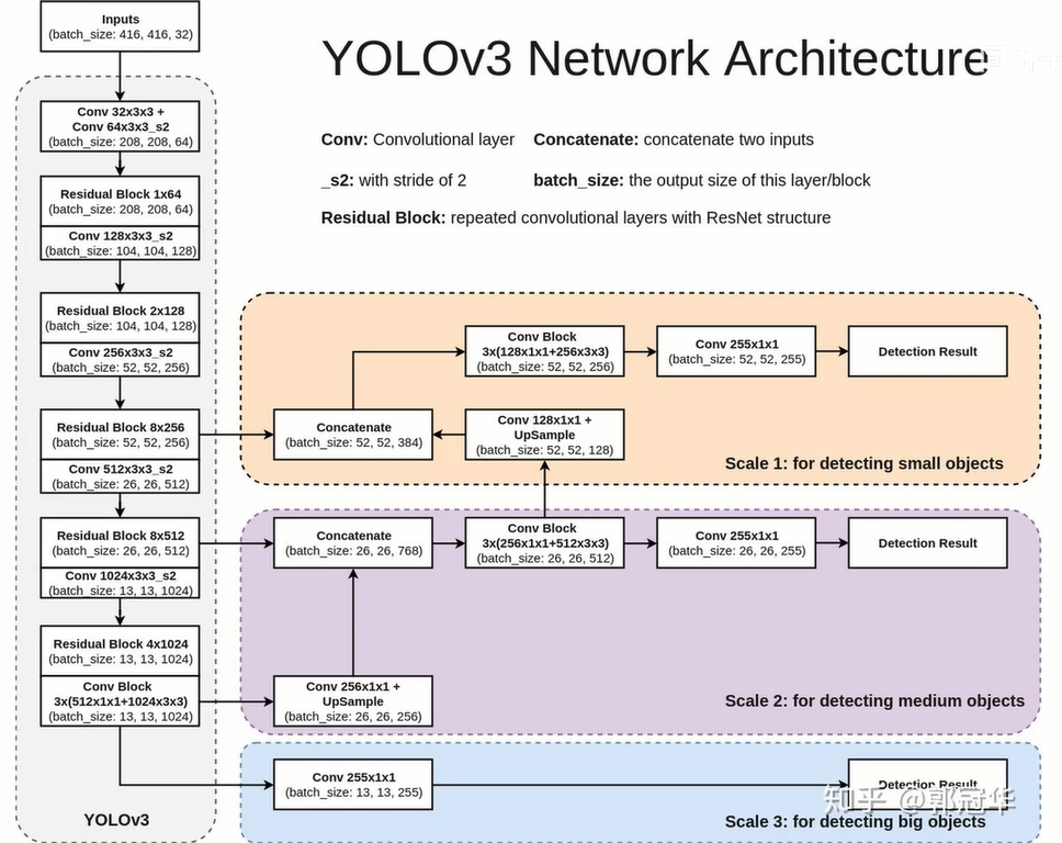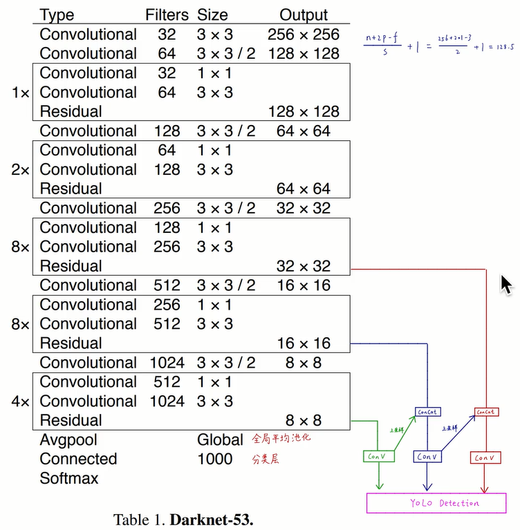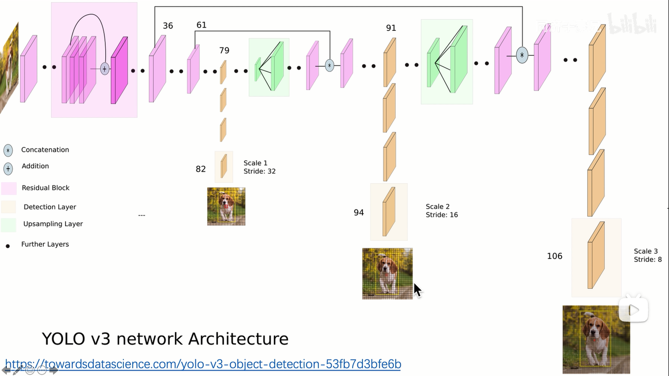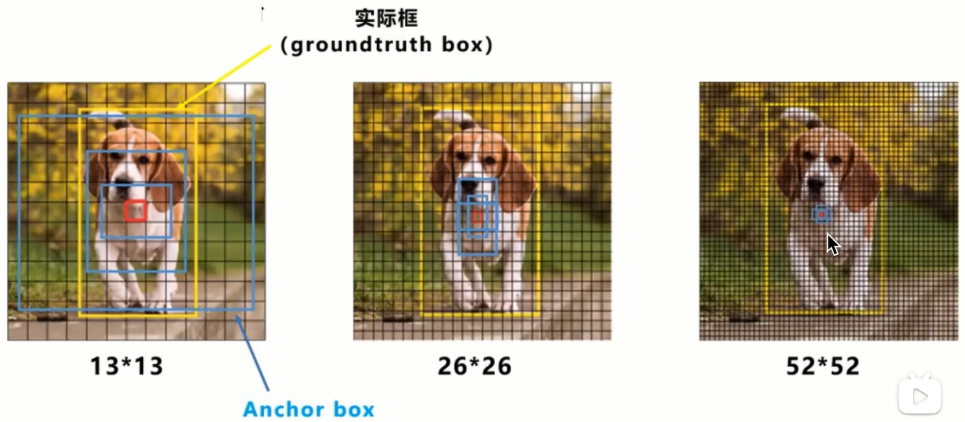 到了yolo3,甚至都没有明确去说明grid cell的划分,而是沿用并扩展了yolo2的思路,最终要输出3种分辨率的feature map,13*13,26*26,52*52
