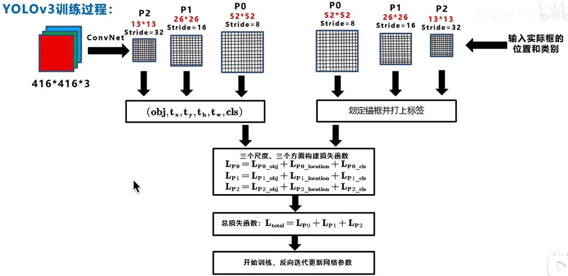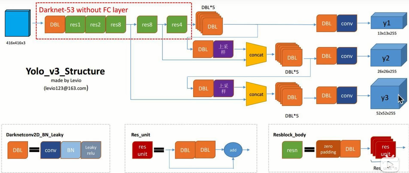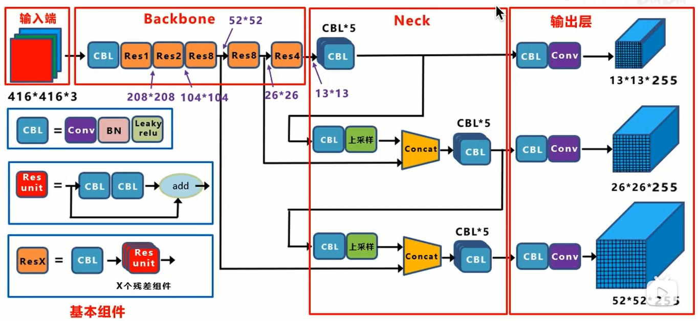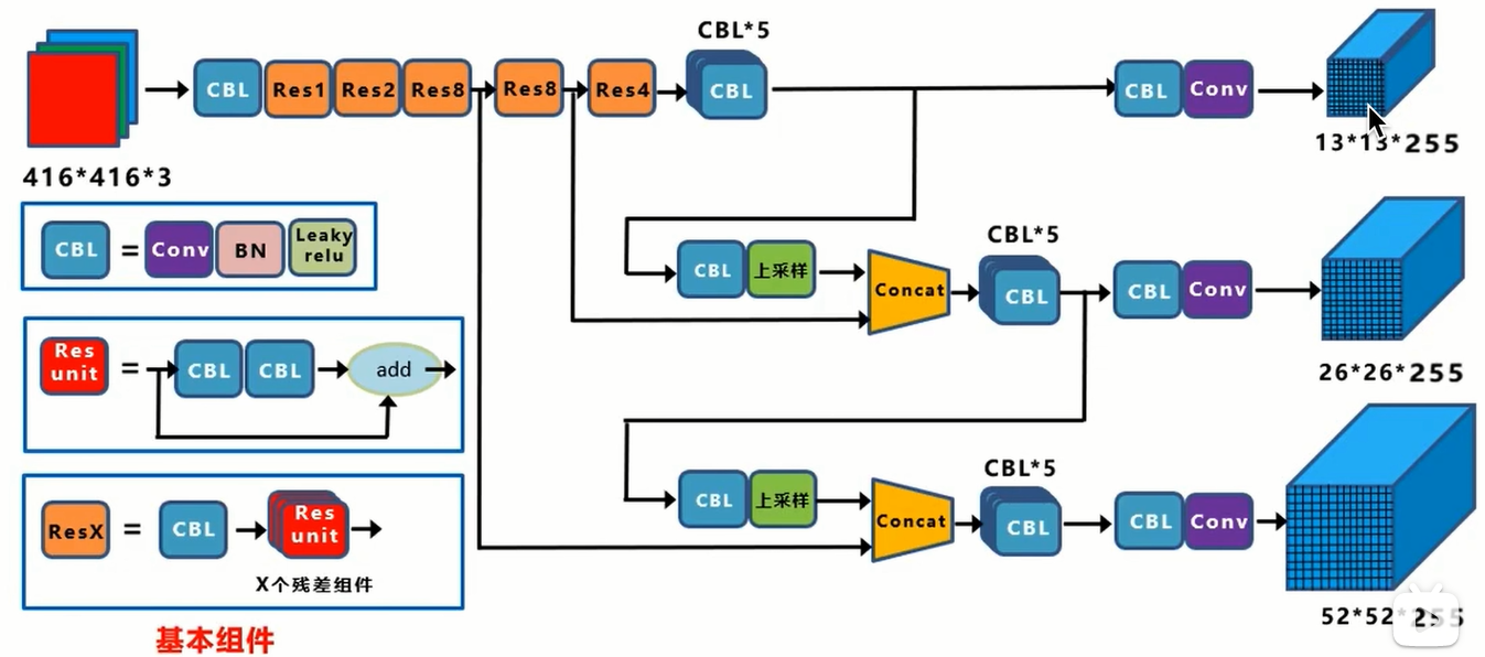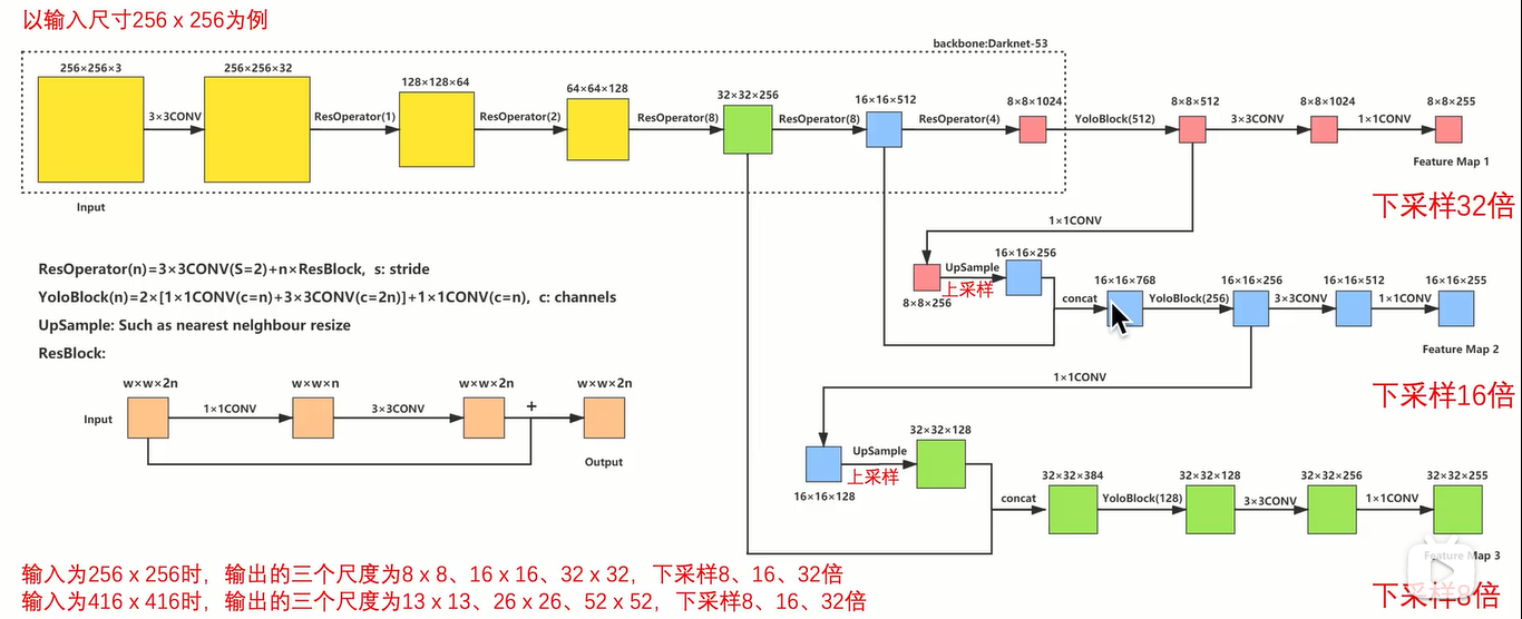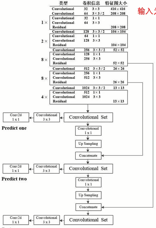 之前结构图的输入是416*416,那么输出的feature map的三个分辨率是13,26,52