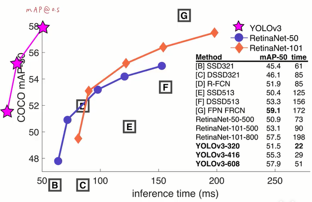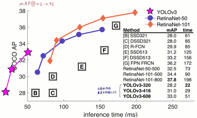 以0.5为步长,计算IoU从0.5到0.95的map.yolo3在速度上确实是一骑绝尘,在准确度上也在可接受的范围内