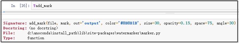 from watermarker.marker import add_markadd_mark()方法一共有8个参数,如果你不知道怎么查看参数,在jupyter notebook可以输入如下命令,即可查看。