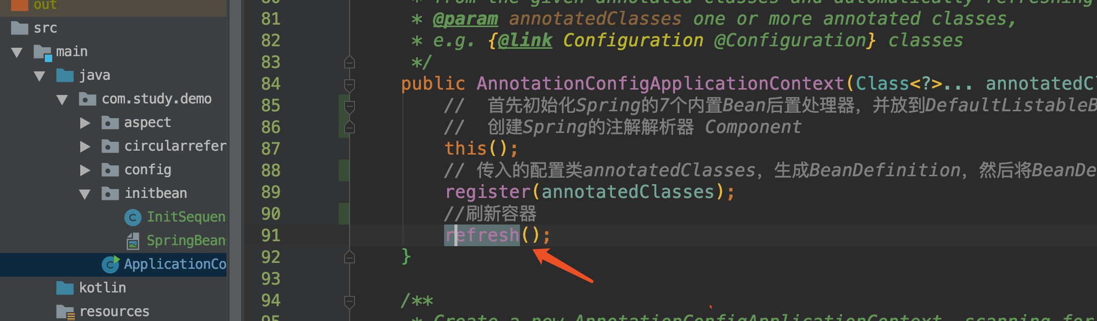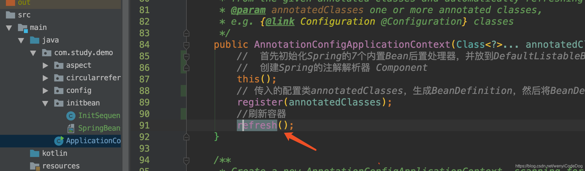 这里我用的是AnnotationConfigApplicationContext作为Spring容器的启动入口,而非ClassPathXmlApplicationContext或FileSystemXmlApplicationContext,不过本质都是一样,核心方法都是refresh()作为入口