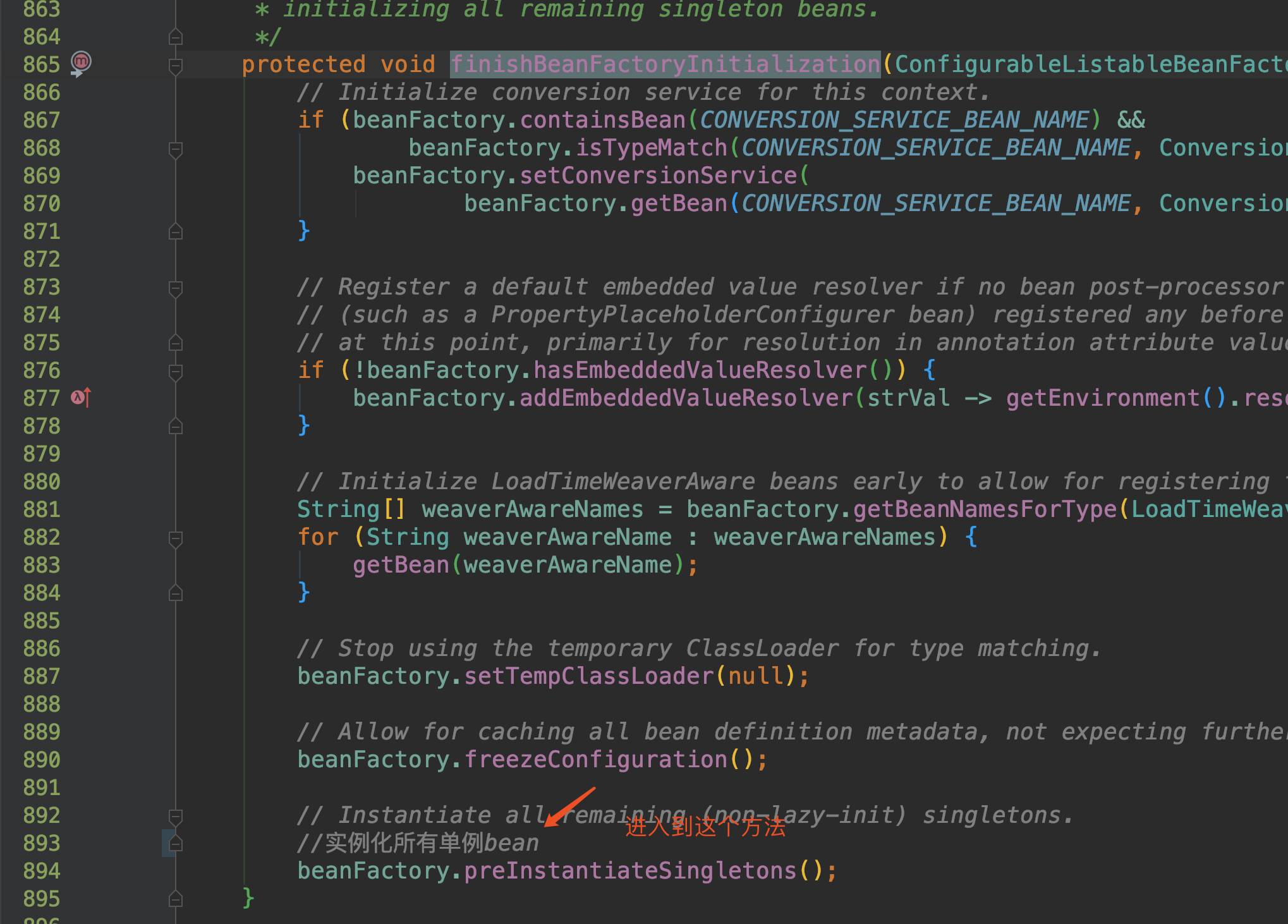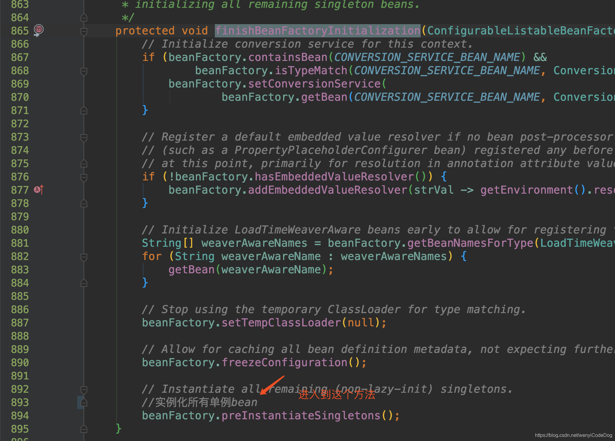 我们自定义的Bean的创建在finishBeanFactoryInitialization(beanFactory)这个方法里面