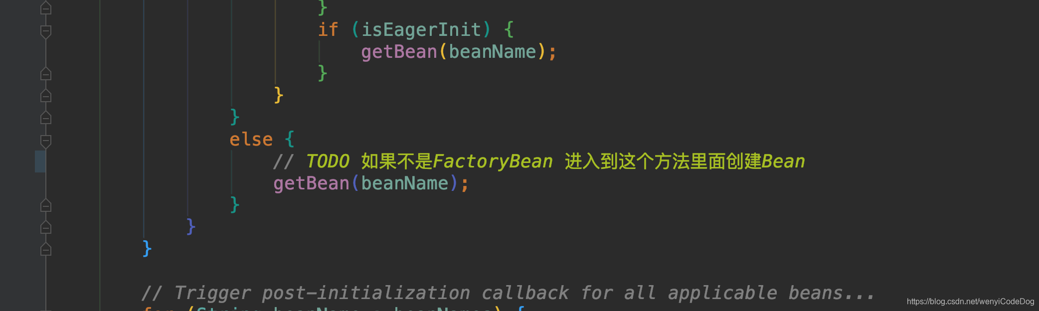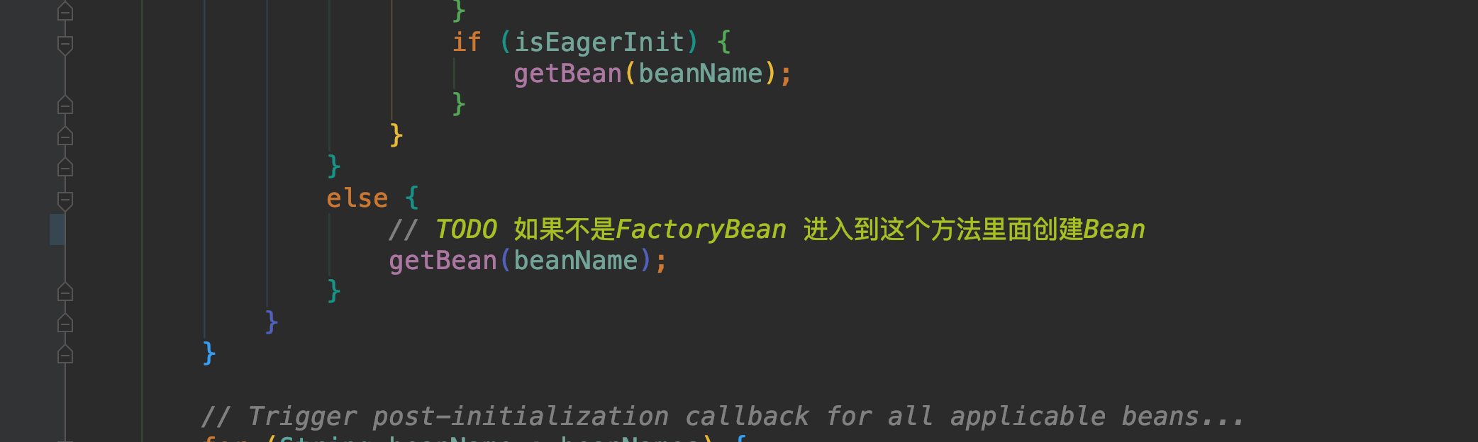 继续往里走进入preInstantiateSingletons方法的getBean方法里面