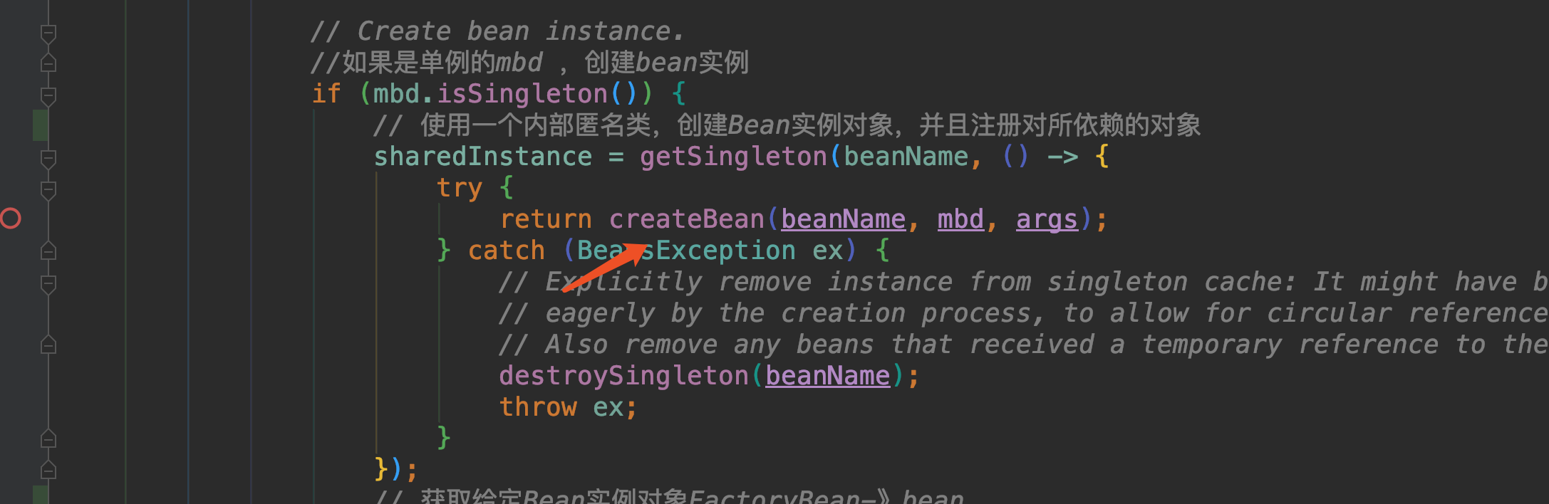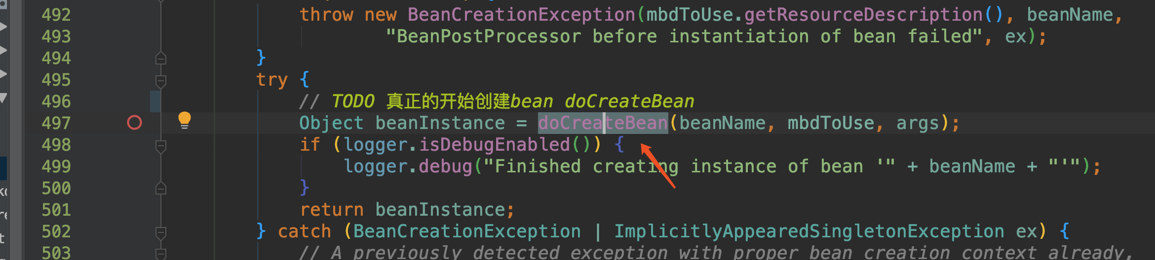 然后就是doCreateBean方法,这个方法里面包含了先从缓存中获取Bean、单例Bean的创建、原型Bean的创建流程,我们进入到单例Bean的创建方法里面去