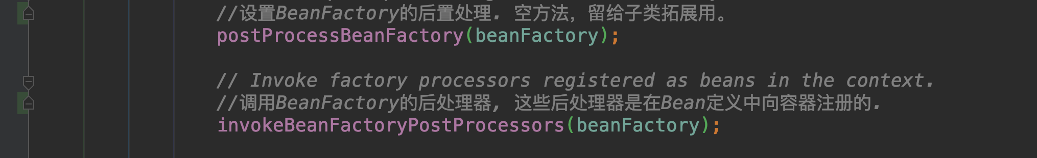 进入到refresh方法里面,这里包含了容器启动的全部大致流程,下图这两个是准备BeanFactory和执BeanFactoryPostProcessor的后置处理器后置方法PostProcessorBeanFactory的调用,如果我们自定义了一个BeanFactoryPostProcessor的实现类,那个执行顺序是先执行BeanFactoryPostProcessor实现类的构造器,然后执行BeanFactoryPostProcessor实现类的后置方法PostProcessorBeanFactory,并且这个后置处理器的执行时机是在最前面的,优于InstatiationAwarePostProcessor、BeanPostProcessor、InitializationBean、@PostConstruc等。
