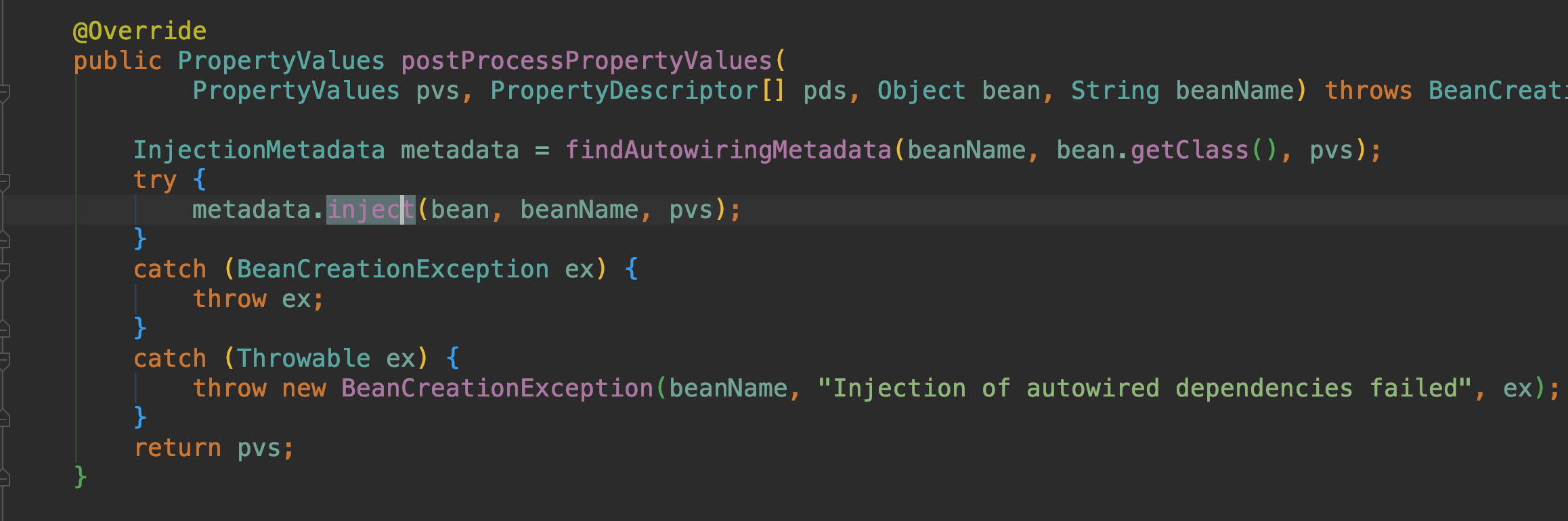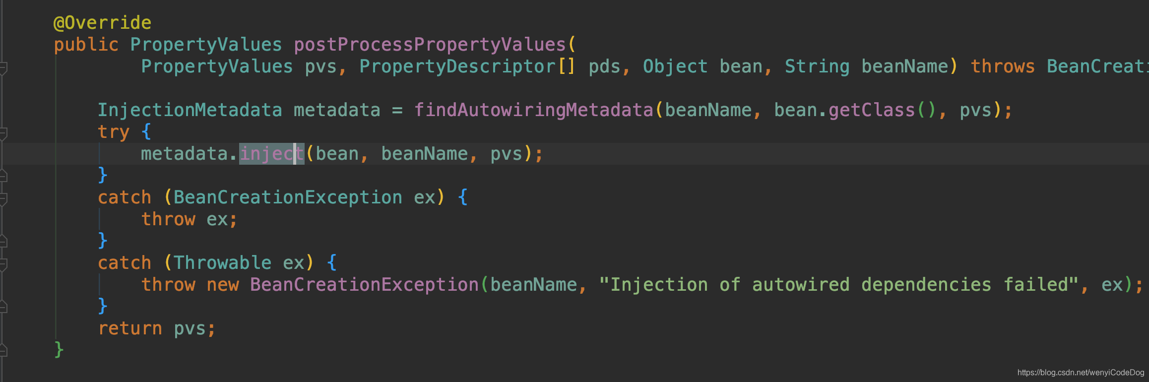 在doCreateBean方法里面,主要完成了①Bean实例的创建、②、处理器修改合并bean定义、③、创建bean 把bean放入到singletonFactories、④、数据填充进实例、⑤、进行bean的初始化,执行后置处理器等,其他的就不再介绍,我们重点看④和⑤、进入到④ 的内部,发现有这么一段逻辑,遍历所有的后置处理器(如果开启AOP,则会执行aop的后置处理器生成代理就是在这里),如果是给属性赋值的后置处理器InstantiationAwareBeanPostProcessor类型,就执行这个后置处理器的后置方法postProcessPropertyValues,进入到这个方法里面则一目了然。