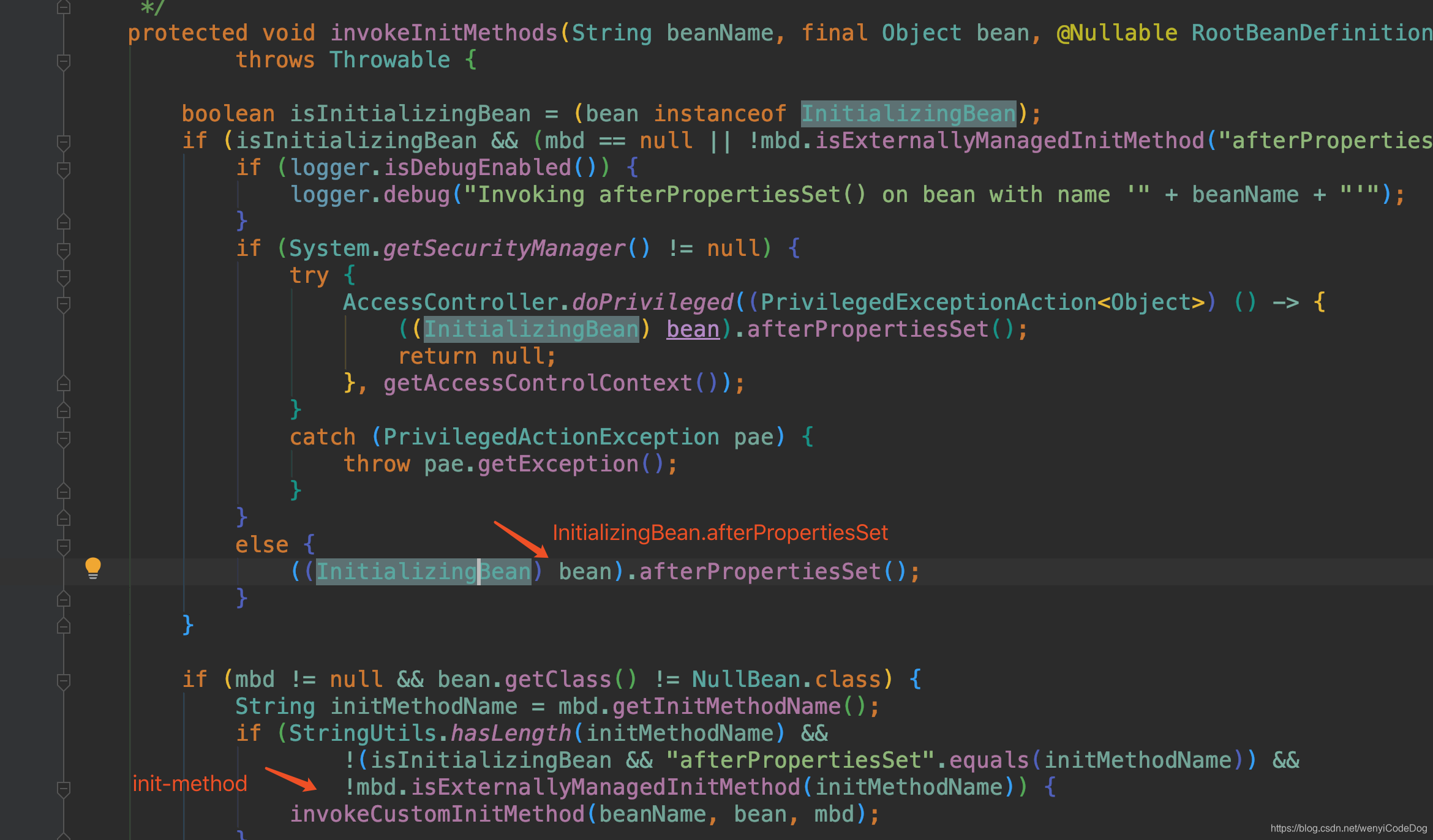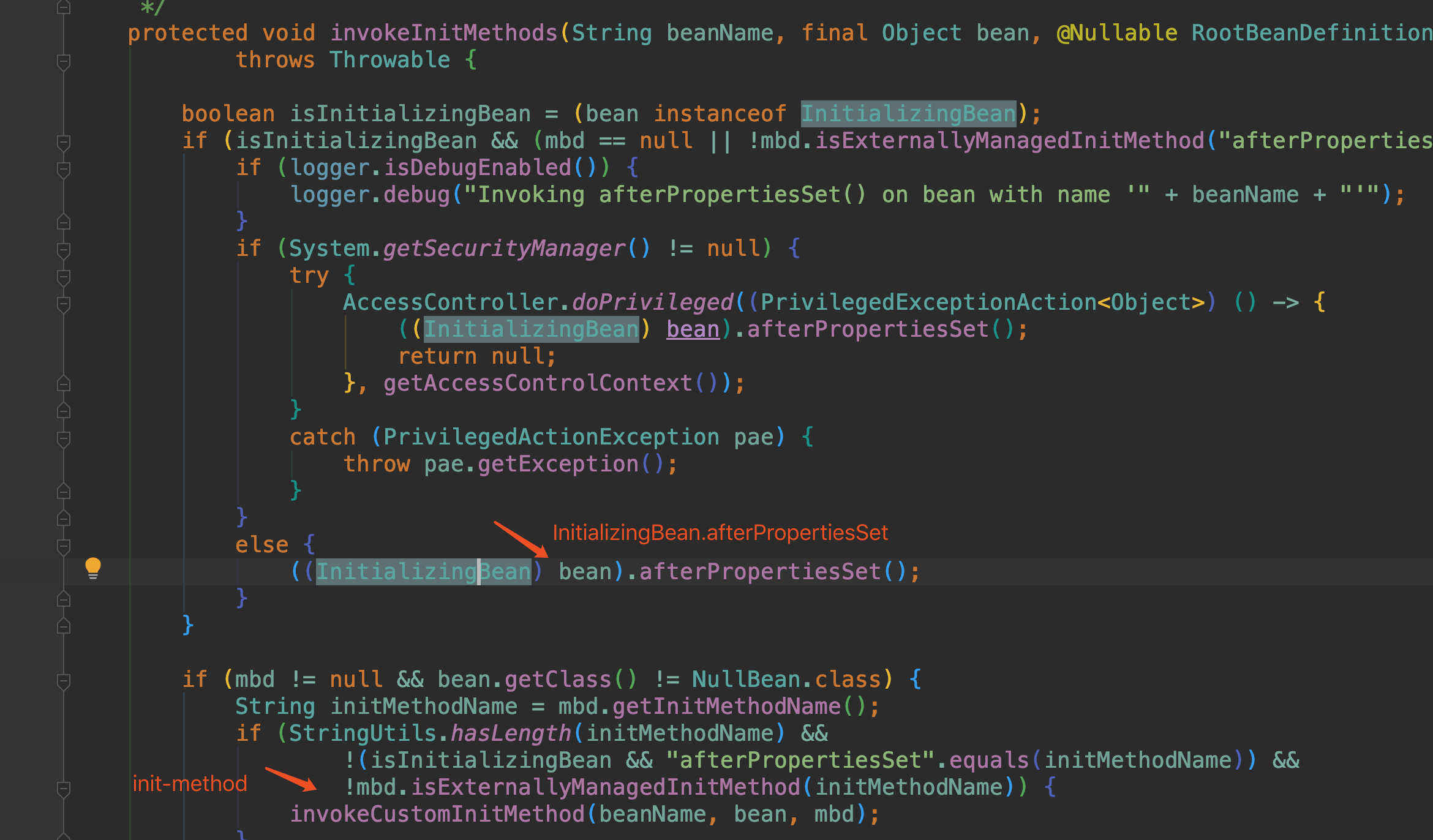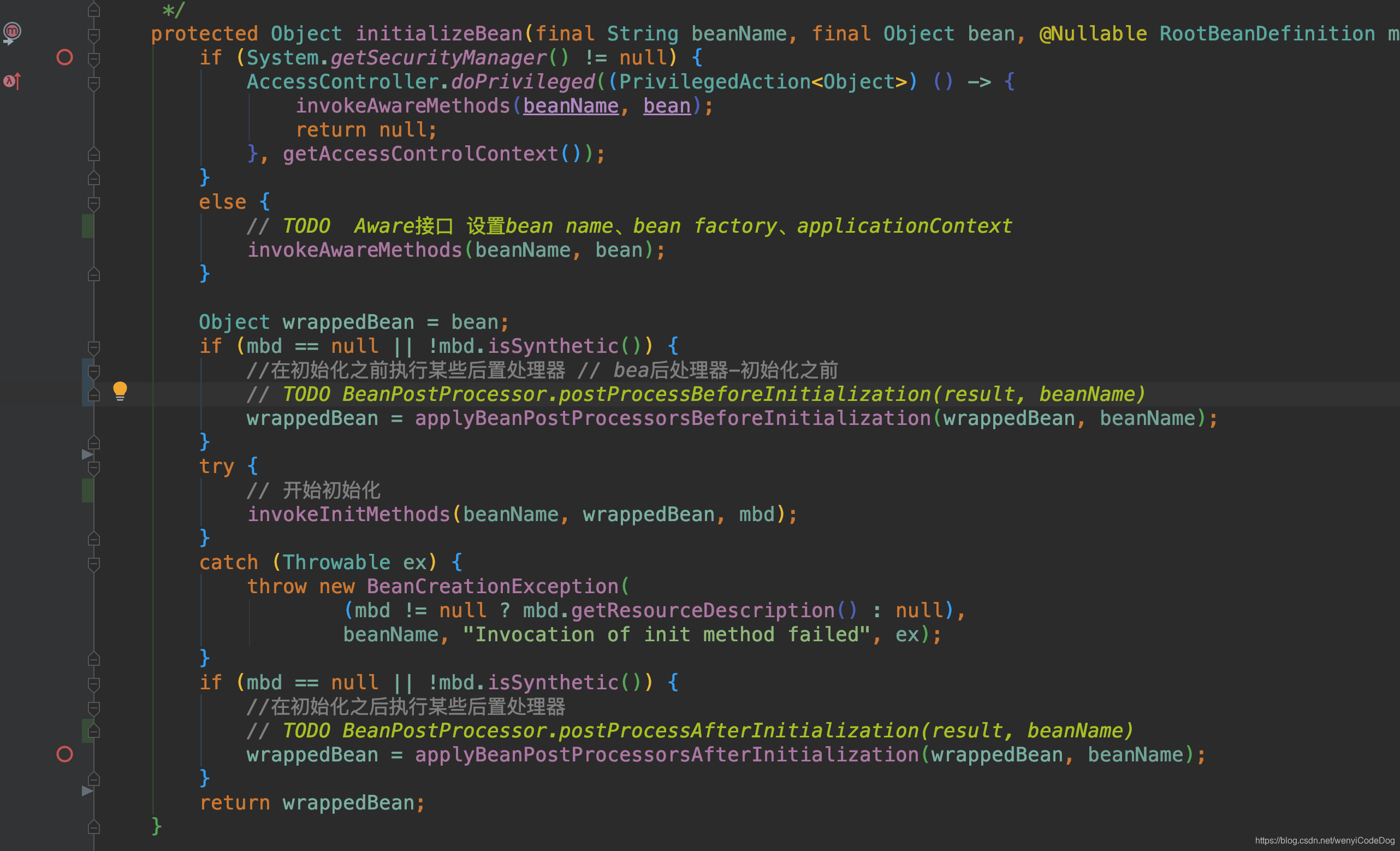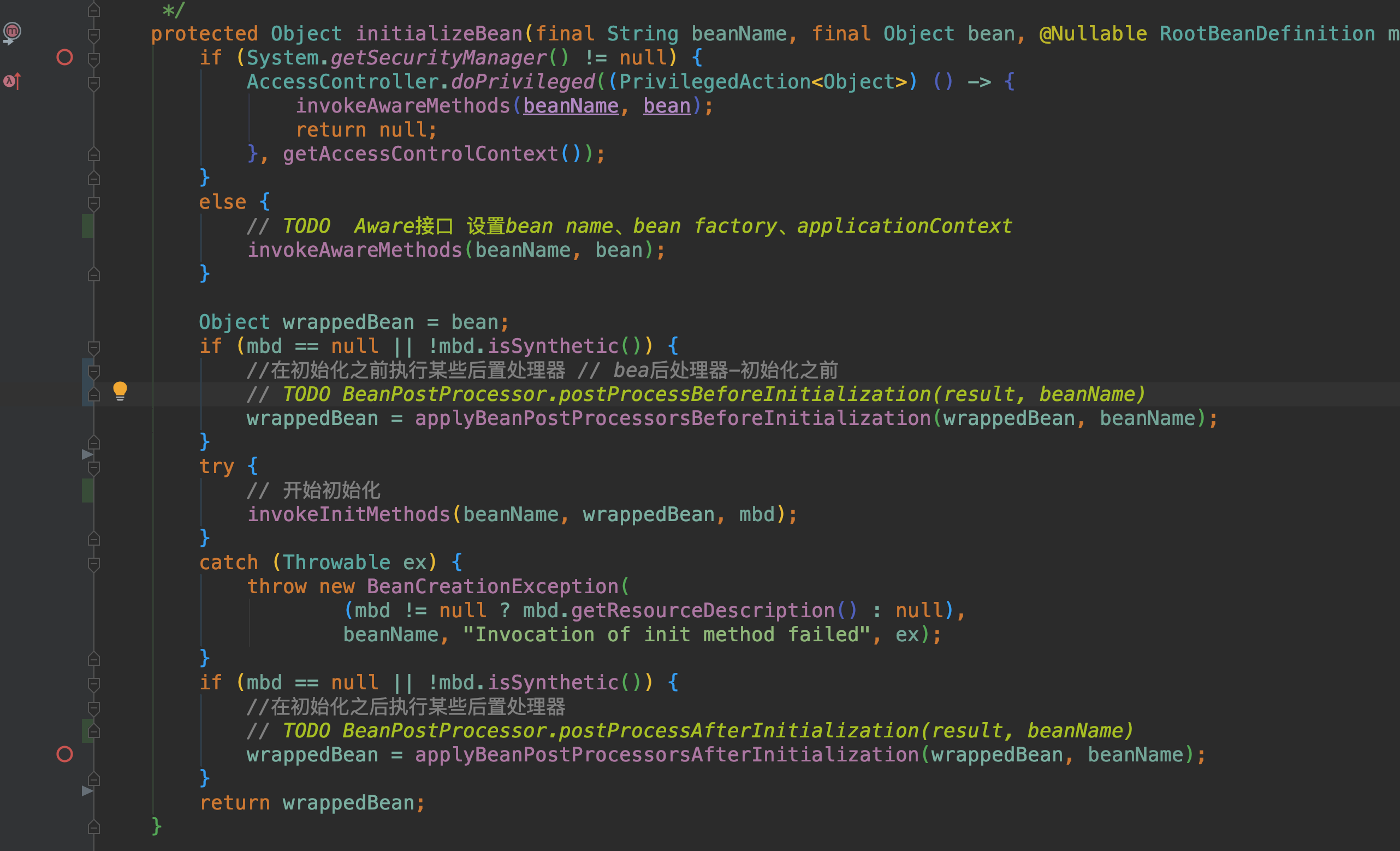 初始化里面会做比较多的事情,首先会进行一些Aware接口的处理工作,然后是初始化前BeanPostProcessor.postProcessBeforeInitialization和初始化后postProcessAfterInitialization接口的调用,在这两个方法中间执行的是init操作,比如接口InitializingBean的afterPropertiesSet方法的调用和配置的init-method方法的调用