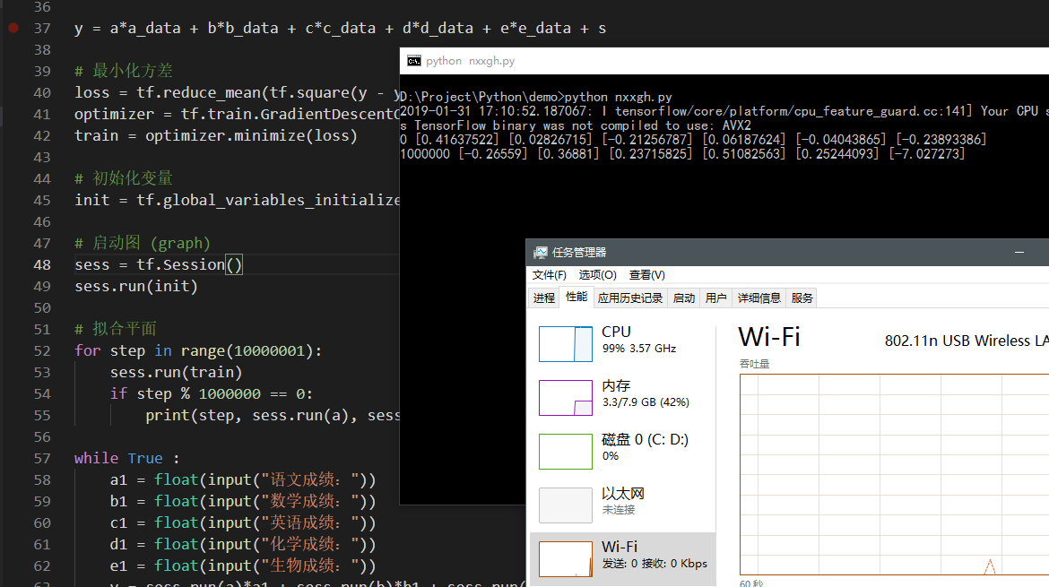 我们只需要使用TF,把上式的各个系数优化到最贴近真实,使得我把一个真实的成绩代入上式后能得到一个较为精确的值。