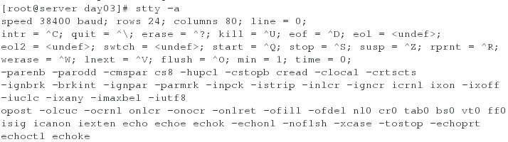 可以使用stty -a命令查看当前注册终端的设置情况。