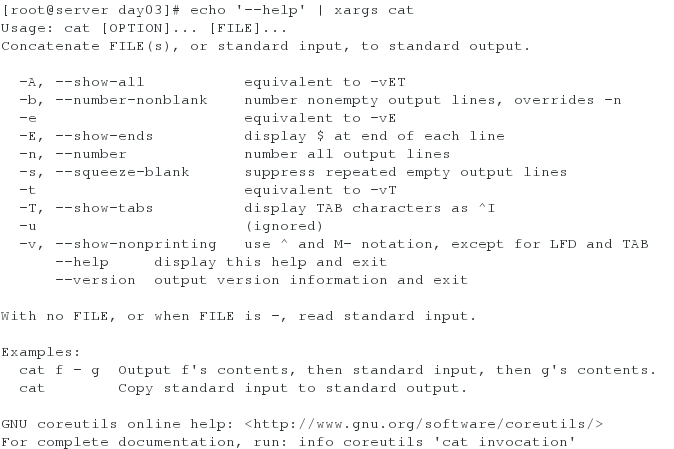 输出:相当于 cat --help的输出,该命令中xargs将其接受的字符串 --help 做成cat的一个命令参数来运行cat命令,同样 echo 'test.c test.cpp' | xargs cat 等价于 cat test.c test.cpp 此时会将test.c和test.cpp的内容都显示出来。