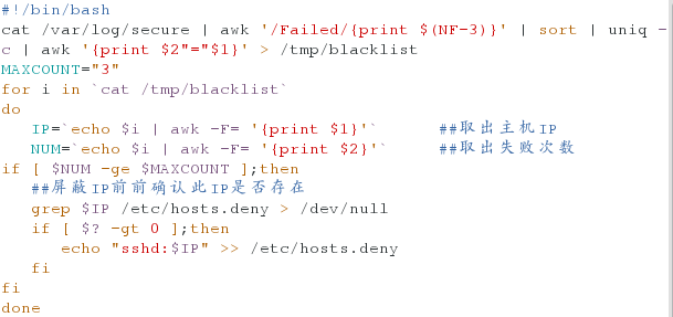 cat /var/log/secure | awk '/Failed/{print $(NF-3)}' | sort | uniq -c | awk '{print $2"="$1}' > /tmp/blacklist