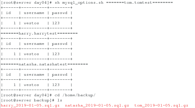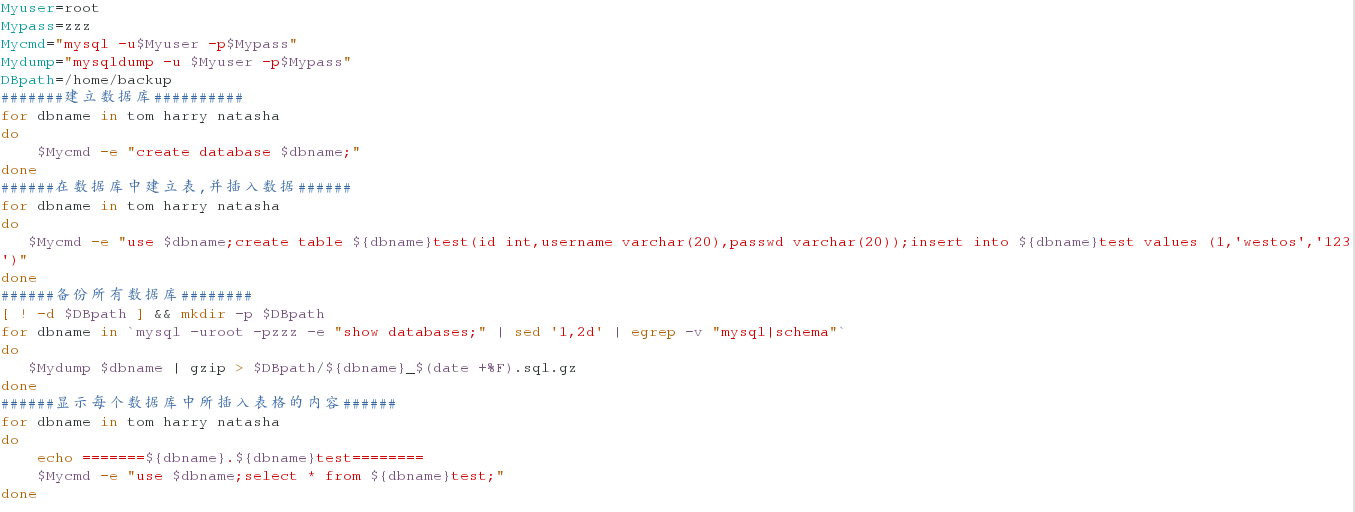 $Mycmd -e "use $dbname;create table ${dbname}test(id int,username varchar(20),passwd varchar(20));insert into ${dbname}test values (1,'westos','123')"