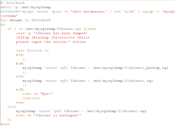数据库备份,执行scriptname.sh $dbpasswd 备份数据库中所有库到/mnt/mysqldump目录中,备份文件名称为“库名称.sql”,当此文件存在时进入交互模式,询问动作,输入“s”跳过备份,输入“b”,备份名称为“库名称_backup.sql”,输入“o”时,覆盖原文件,输入“e”退出