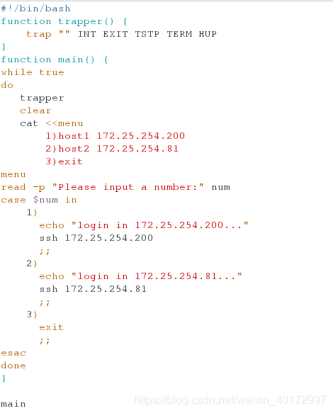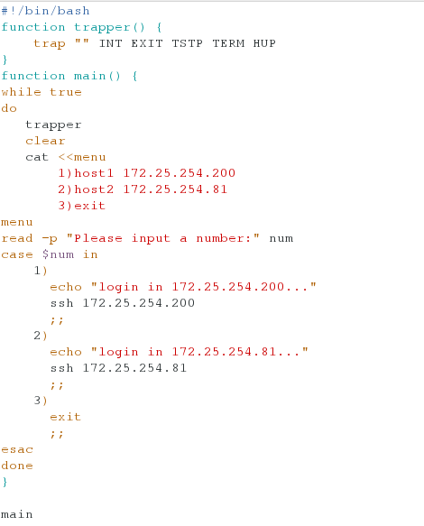 很多大公司的服务器都不允许直接登录,而是通过一个跳板机才能登录过去。在跳板机中,通常只能执行几个少数命令(如SSH),而其他命令是不允许执行的,这个需求实质上就是拦截用户的输入,在用户与shell之间加一道门,而脚本的功能,就是根据用户不同的输入采取不同的动作,脚本的长短也就跟需要的命令的多少有关,需要的命令越多,脚本需要判断的就越多,脚本也就越长,但实际并不需要为每个命令都写一个action,只要为每个种类的写一个action就行了,