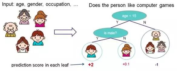 根据一些 feature 进行分类,每个节点提一个问题,通过判断,将数据分为两类,再继续提问。这些问题是根据已有数据学习出来的,再投入新数据的时候,就可以根据这棵树上的问题,将数据划分到合适的叶子上。