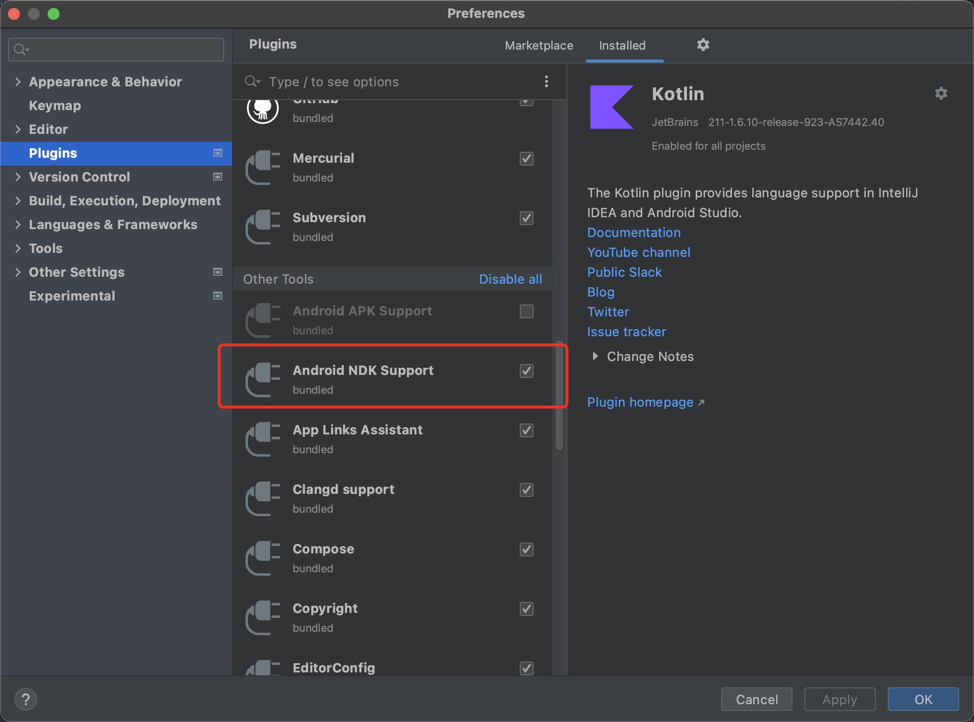 先打开插件,勾选Android NDK Support,重启android studio即可