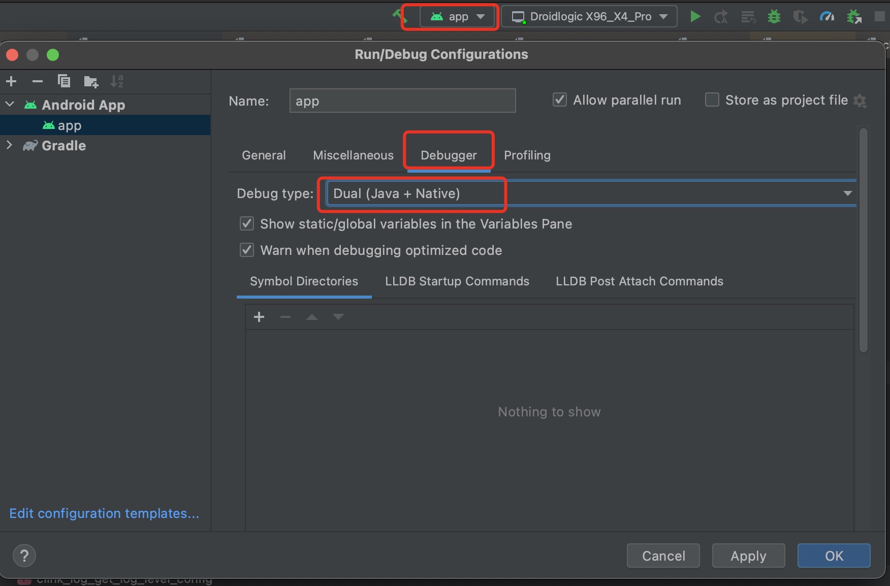 使用了很久的android studio,发现在c/c++代码打断点的时候,一直无法命中,按网上的说法要在Debugger中开启native类型(如图),但本人的环境无论如何配置,都根本找不到这个所谓的Debugger标签。一度怀疑是版本问题,更新了多次版本,也一样没有这个Debugger。网上好像也没什么人会遇到这样的情况,实在让人沮丧。