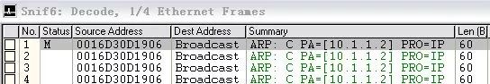 显然这个ARP广播是可以被B收到的(因为他们同处一个vlan),而11.1.1.1正好就是B的IP地址,理所当然B要回应这个ARP请求。下图是A上的抓包情况,A首先进行了ARP广播,然后收到了B的应答。